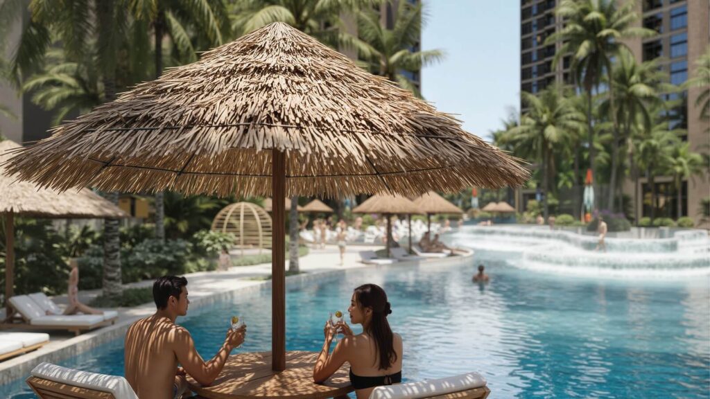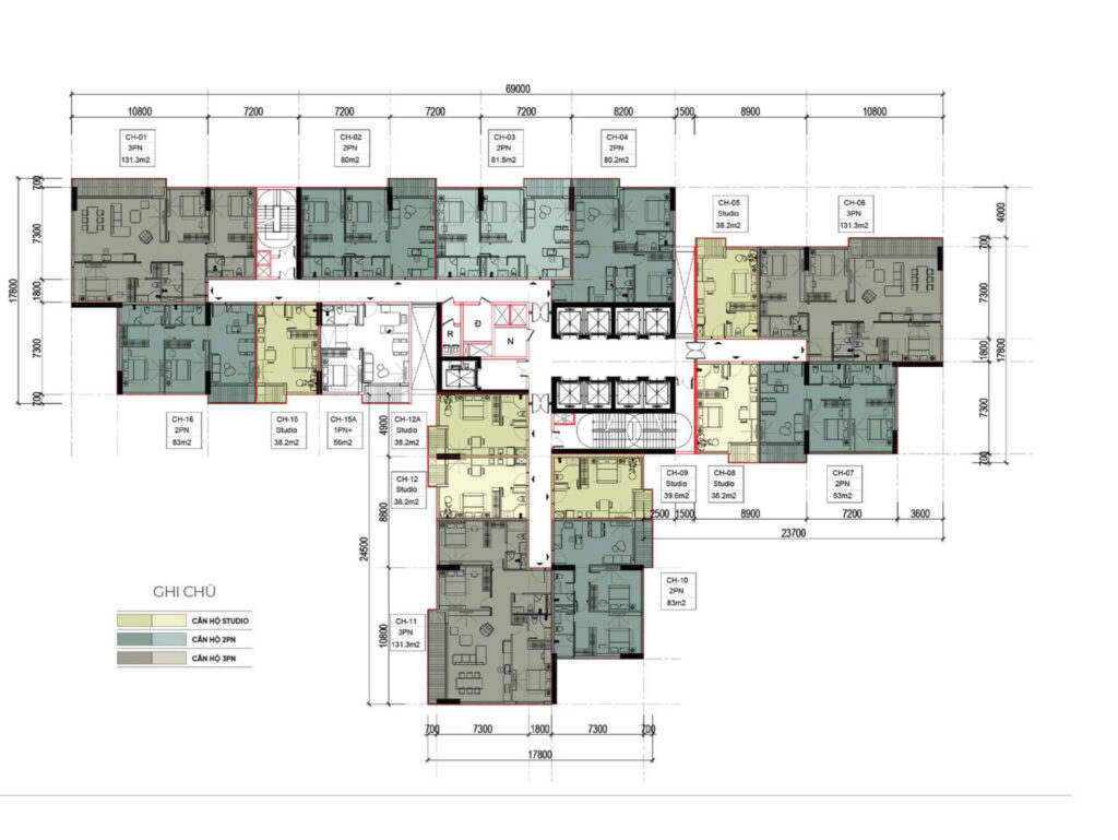 Cơ cấu căn hộ đa dạng với 6 loại hình sản phẩm: Studio (38,2m²) chiếm 38% tổng số căn lý tưởng cho cho thuê, 1PN+ (54,5-57,4m²) chiếm 19% phù hợp cặp đôi trẻ, 2PN (81,5-84,1m²) chiếm 23% dành cho gia đình nhỏ, 3PN (127,7m²) chiếm 17% cho gia đình đa thế hệ, Duplex (93,8-225,9m²) chiếm 2% phục vụ không gian SOHO biệt lập, và Penthouse (170-280,7m²) chiếm 1% mang tầm nhìn panorama thượng lưu.