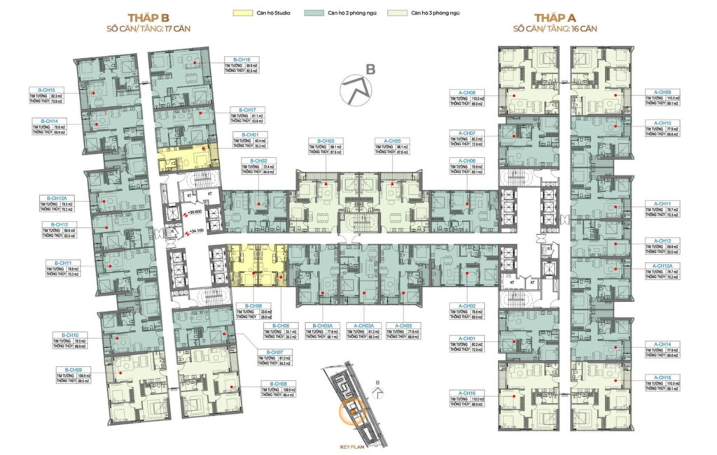Sunshine Grand City được thiết kế với mặt bằng tầng điển hình thông minh, bao gồm 2 tháp chung cư (Tháp A và Tháp B) kết nối với nhau thông qua sảnh trung tâm rộng rãi. Tháp A có mật độ 16 căn/tầng trong khi Tháp B có 17 căn/tầng, tạo sự cân đối về quy mô và đảm bảo tính riêng tư cho cư dân. Mỗi tầng được bố trí đa dạng các loại căn hộ từ Studio, 2 phòng ngủ đến 3 phòng ngủ với diện tích linh hoạt, phù hợp với nhu cầu đa dạng của các gia đình.Điểm nổi bật của thiết kế mặt bằng là sự tối ưu hóa ánh sáng tự nhiên và thông gió cho từng căn hộ. Các căn hộ đều được thiết kế với ban công rộng rãi, cửa sổ lớn tận dụng tối đa tầm nhìn ra sông Hồng và cảnh quan nội khu xanh mát. Hệ thống hành lang được bố trí thông minh với khu vực thang máy, thang bộ thoáng khí nằm ở vị trí trung tâm, đảm bảo di chuyển thuận tiện và an toàn cho cư dân. Mỗi căn hộ đều có diện tích thông thủy hợp lý, phân chia công năng rõ ràng giữa khu vực sinh hoạt chung, phòng ngủ và khu vực phụ trợ, đáp ứng tiêu chuẩn sống hiện đại theo phong cách Detox Living.